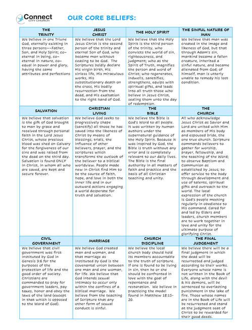 These are the core beliefs of Connect City Church based on the foundational truths taught in the bible. All of our teaching and ministry is rooted in and flows out of these biblical doctrines.